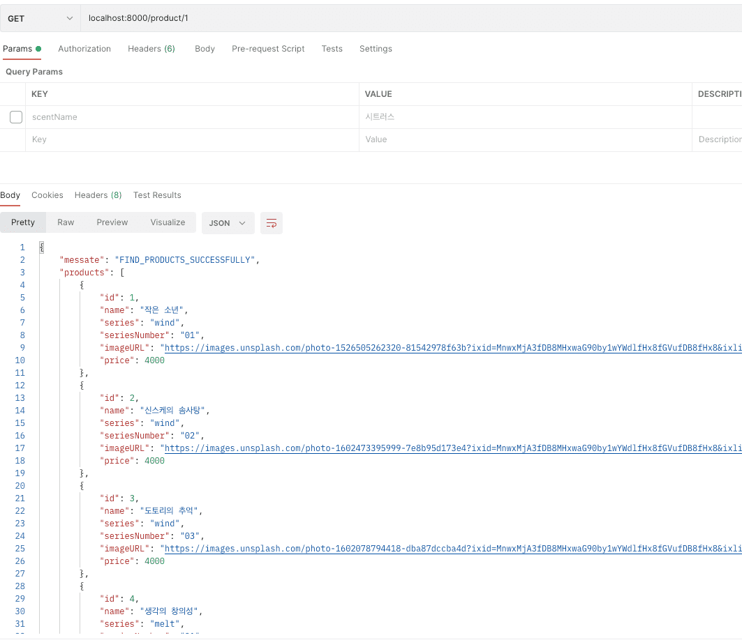 간과한게 하나 있었는데, query parameter로 상품의 향이 아무것도 넘어오지 않는다면 그냥 전체 상품에 대한 데이터를 뿌려줬어야했던 것…! 아무리 저 sql문에서 휘뚜루마뚜루 추가를 해보고 고쳐봐도 빈 배열을 뿌려주는 야속한 상황이 일어났고…ㅜ 결국에는 query parameter을 사용하는 로직을 따로 분리를 해주었다.